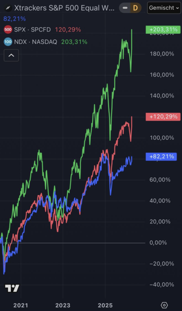 Beim Zollschock im Frühjahr 2025 gab der Equal Weight mit nach – sein damaliges Hoch hat er bis heute nicht zurückerobert, während S&P 500 und Nasdaq 100 längst wieder Rekorde feiern.