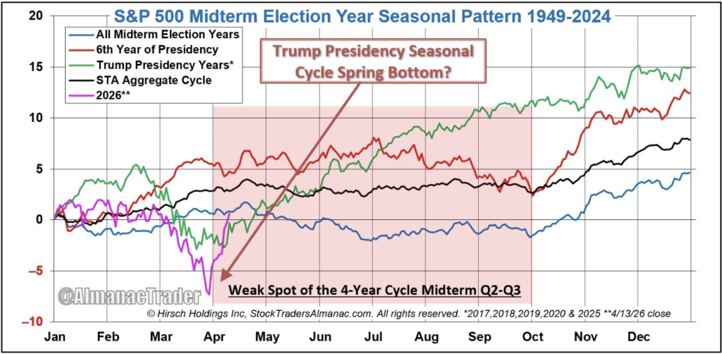 Die Erholung in S&P 500 und Nasdaq 100 kam schnell (wobei DAX, Eurostoxx und Co. nicht so weit gelaufen sind). Ein Blick auf die Saisonalität zeigt aber: In Midterm-Jahren sind genau solche Bewegungen typisch – schwächeres Frühjahr, gefolgt von Gegenbewegungen, während sich nachhaltige Trends oft erst später im Jahr herausbilden.