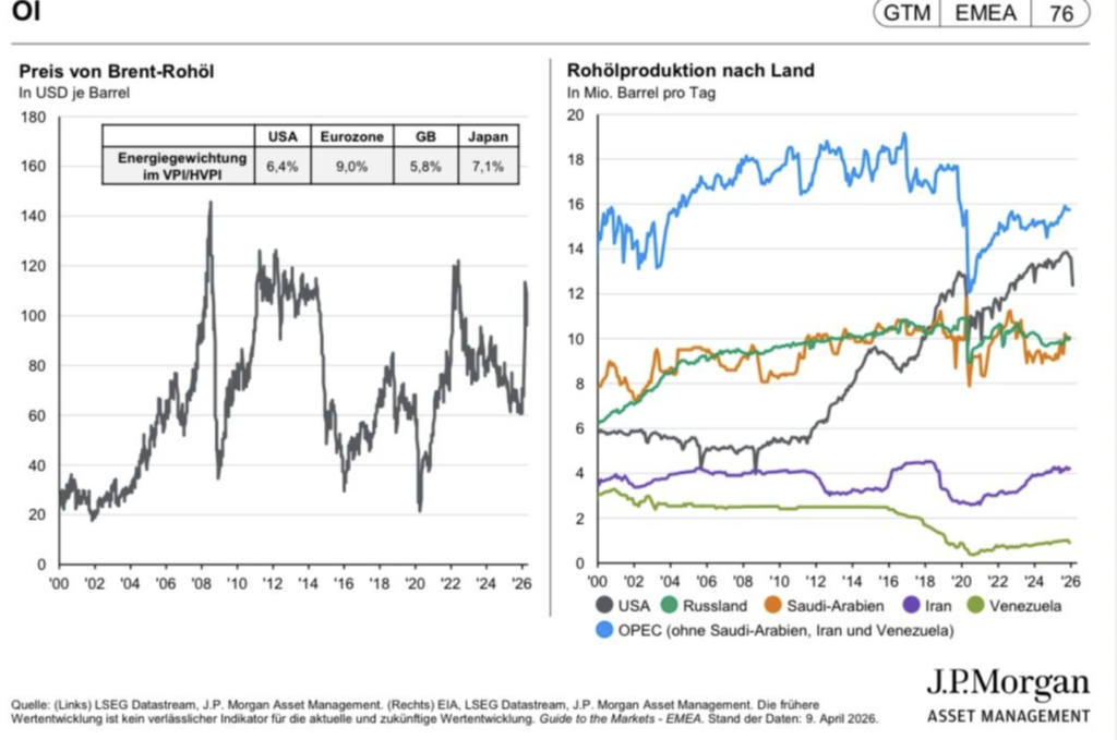Der Ölpreis wird aktuell wieder intensiv diskutiert, vor allem im Zusammenhang mit der Straße von Hormus und den geopolitischen Spannungen. Wenn man sich die Daten von J.P. Morgan Asset Management anschaut und speziell die Phase von 2011 bis 2014/15 herausgreift, wird klar, warum eine isolierte Betrachtung zu kurz greift.
